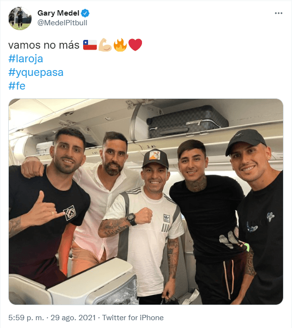 Es el caso que dio a conocer este domingo Gary Medel. El defensor nacional que milita en el Bologna compartió una foto en sus redes sociales compartiendo junto a Claudio Bravo, Erick Pulgar, Enzo Roco y Guillermo Maripán, donde todos venían en camino a Santiago.