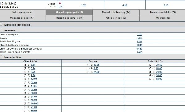 Pese a los magros resultados, La Roja Sub 20 es ampliamente favorita para vencer al combinado boliviano.Marathonbettrae las mejores cuotas y en esta oportunidad indica que Chile paga 1.32 y por su parte Bolivia 9.10. La opción empate por el instante está en 4.95.