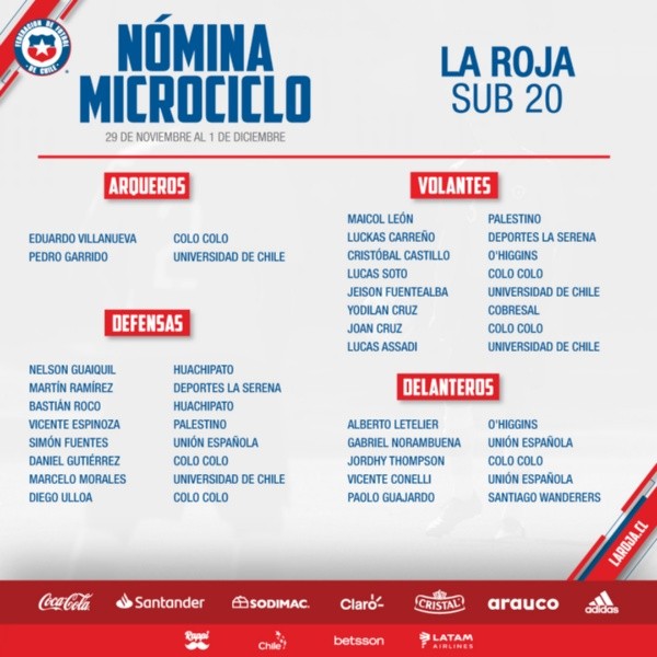 Entre los seleccionados se encuentran Joan Cruz y Daniel Gutiérrez de Colo Colo, los que han demostrado sus dotes en Primera División, así como también Marcelo Morales y Lucas Assadi de Universidad de Chile.