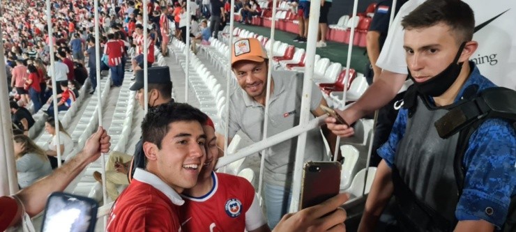 El futbolista con pasos en la Universidad de Chile fue solicitado por los hinchas en el recinto deportivo, donde aprovechó las instancias para sacarse fotos con los fanáticos que viajaron hasta la ciudad de Asunción para hacer sentir el apoyo a la roja de todos.