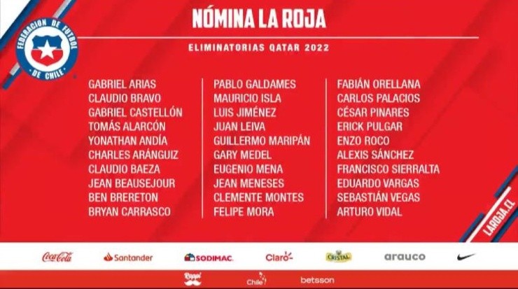 El resto de la nómina no hay mucha sorpresa y son nombres que se han repetido bastante durante el tiempo: Claudio Bravo, Gary Medel, Arturo Vidal, Alexis Sánchez, Eduardo Vargas, Guillermo Maripán, entre otros.