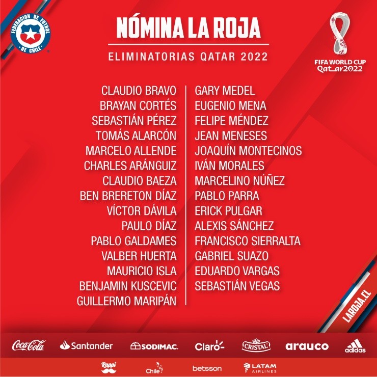 La Selección Chilena confirmó hace pocos minutos la nómina de los futbolistas que fueron convocados a ser parte de este nuevo proceso de las Eliminatorias a Qatar 2022. Duelos cruciales son los que se aproximan para el elenco nacional, considerando que el próximo jueves 27 de enero recibirán a Argentina y el martes 1 de febrero visitarán a Bolivia.