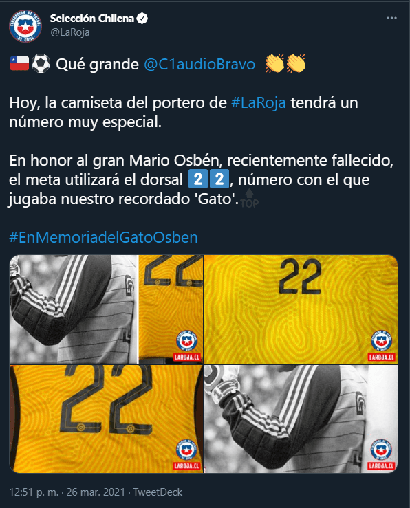 La modificación en el dorsal recae producto de que el ‘Gato’, como era conocido don Mario Osbén, era el que ocupaba en su debido momento con la Selección Chilena y que portará en la espalda el golero Bravo para este nuevo amistoso.