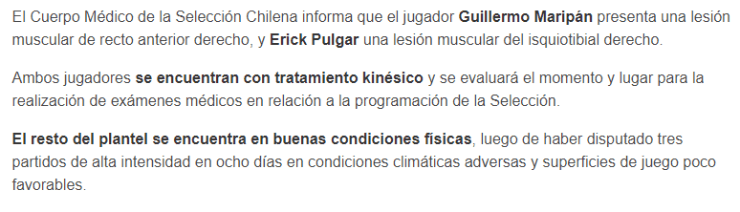 Parte médico de la Selección Chilena.