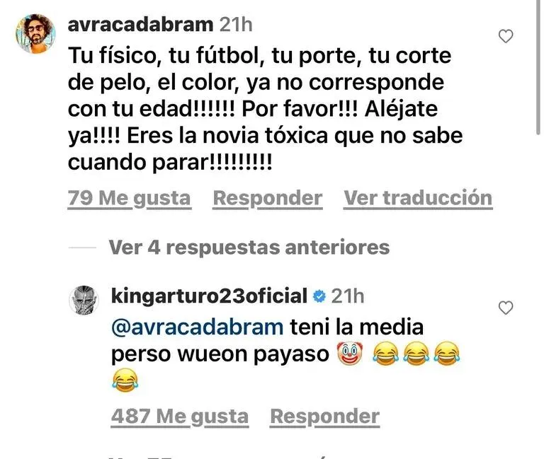 El usuario avracadabram no tuvo piedad con el King y le escribió “Tu físico, tu fútbol, tu porte, tu corte de pelo, el color ya no corresponde con tu edad! Por favor! Aléjate ya! Eres la novia tóxica que no sabe cuando parar”.