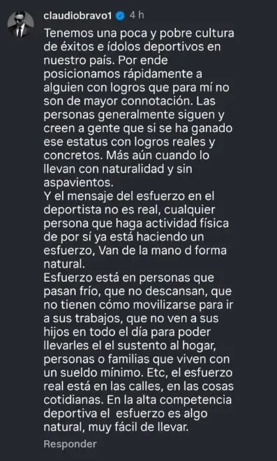 Si bien Bravo borró su comentario a los pocos minutos, su comentario quedó registrado y rápidamente viralizado. En su reflexión, el bicampeón de América lapidó al actual influencer y pareja de Emilia Dides.