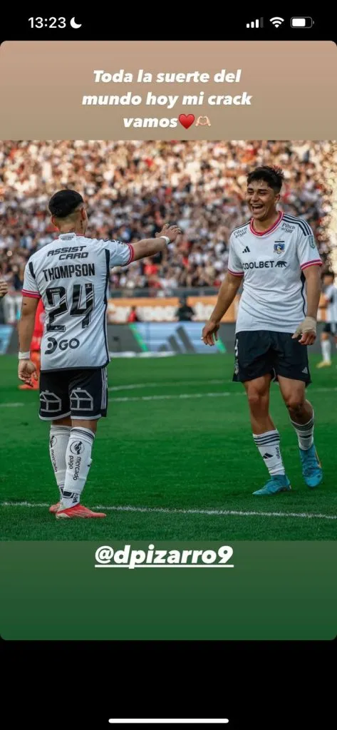 “Toda la suerte del mundo hoy mi crack vamos“, fue lo que indicó Thompson en sus historias de Instagram etiquetando a Damián Pizarro.
