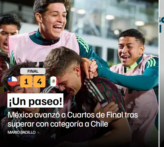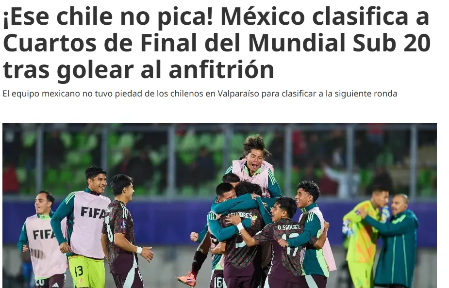 Al menos así lo hizo sentir con su “tallita” el portal Récord, donde en su titular dijeron: “¡Ese chile no pica! México clasifica a Cuartos de Final del Mundial Sub 20 tras golear al anfitrión”.