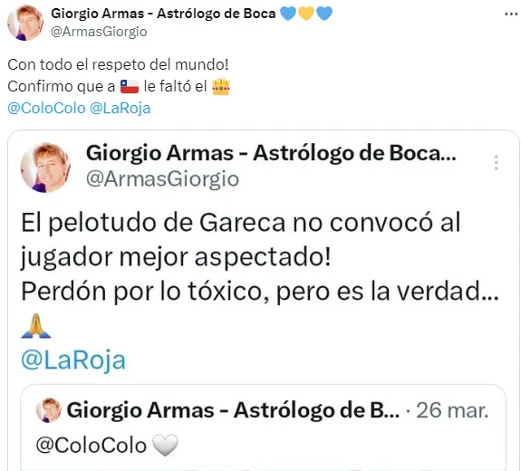 Esta vez, el astrólogo revivió dicha polémica reposteando aquella misma publicación insistiendo: “Con todo el respeto del mundo, creo que a Chile le faltó el ‘King'”.