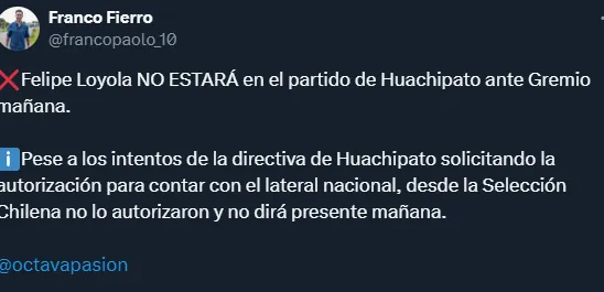 “Felipe Loyola no estará en el partido de Huachipato ante Gremio mañana. Pese a los intentos de la directiva de Huachipato solicitando la autorización para contar con el lateral nacional, desde la Selección Chilena no lo autorizaron y no dirá presente mañana”, declaró.