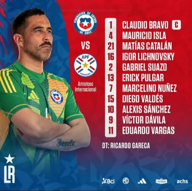 Por esto, el equipo que saltará a la cancha será con: Claudio Bravo en portería; Mauricio Isla, Matías Catalán, Igor Lichnovsky y Gabriel Suazo en la defensa; Erick Pulgar, Marcelino Núñez, Diego Valdés, Alexis Sánchez y Víctor Dávila en el mediocampo; Eduardo Vargas solo en punta.