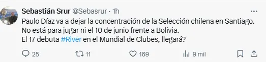 Paulo Díaz va a dejar la concentración de la Selección Chilena en Santiago. No está para jugar ni el 10 de junio frente a Bolivia. El 17 debuta River en el Mundial de Clubes. ¿Llegará?”, informó el comunicador.