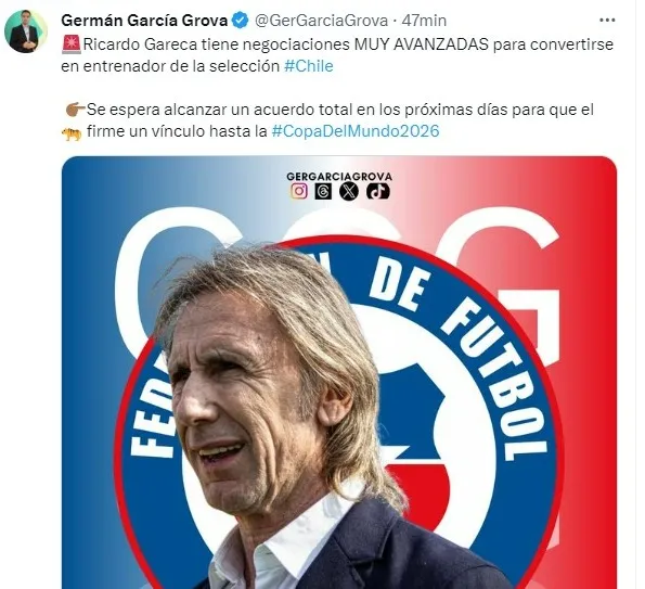 “Ricardo Gareca tiene negociaciones muy avanzadas para convertirse en entrenador de la Selección de Chile. Se espera alcanzar un acuerdo total en los próximas días para que el ‘Tigre’ firme un vínculo hasta la Copa del Mundo 2026“, expresó.