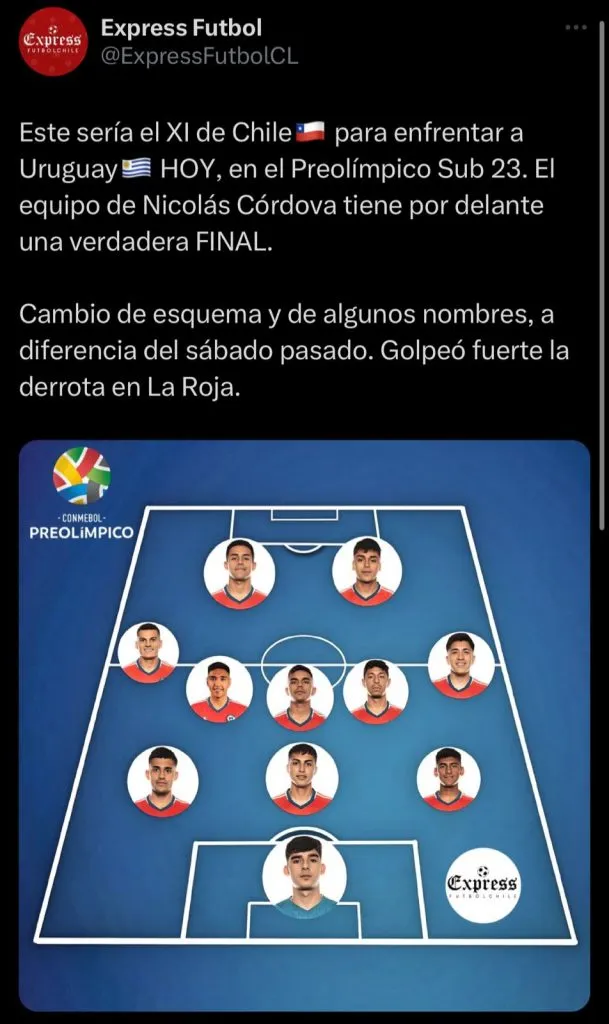 Para este compromiso, el estratega de la sub 23, Nicolás Córdova golpeó el tablero y tras el papelón en el debut ante Perú, en esta jornada saldrá con una inédita formación para medirse ante el equipo de Marcelo Bielsa.