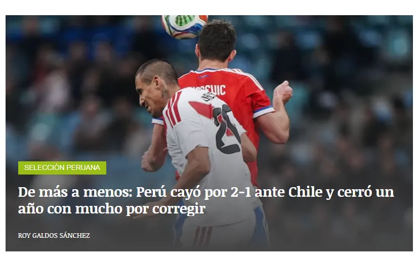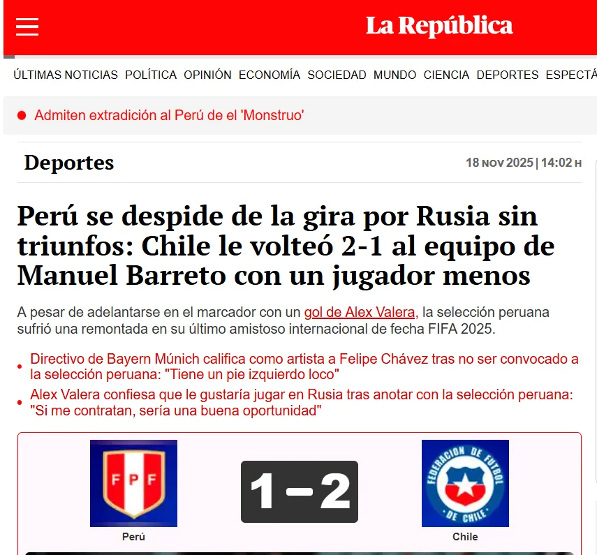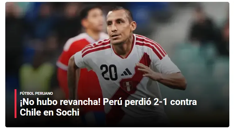 “No les podemos ganar” y “no fue el resultado esperado”, lanzó RPP en su sitio web, mientras que Depor apuntó que el equipo de Manuel Barreto fue “de más a menos”, y que la caída ante la selección chilena “deja muchas lecciones en la ‘Bicolor’, que cierra un 2025 para el olvido”.