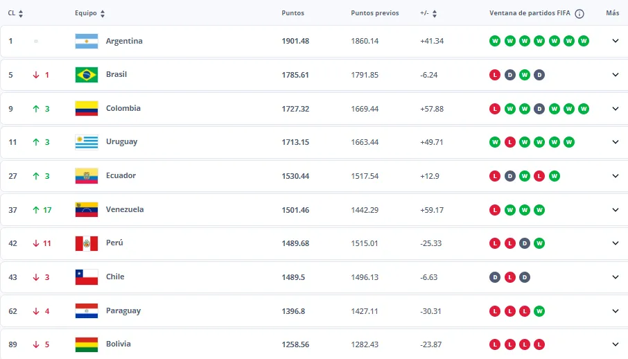 ¿Cómo están los países de la Conmebol en el Ranking FIFA?