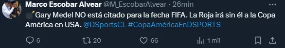 Gary Medel NO está citado para la fecha FIFA. La Roja irá sin él a la Copa América en Estados Unidos”, fue lo que informó el comunicador.