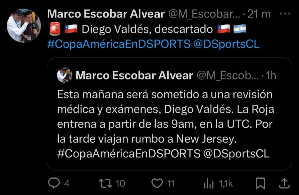 El periodista Marco Escobar informó hace unos instantes que Diego Valdés queda prácticamente descartado para el duelo ante la Selección de Argentina, siendo este un importante problema para Ricardo Gareca.