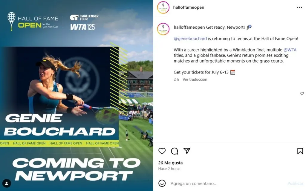 “Genie Bouchard regresa al tenis en el Hall Of Fame Open. Con una carrera destacada con una final de Wimbledon, múltiples títulos de la WTA y una fanaticada en todo el mundo, el regreso de Genie promete partidos emocionantes y momentos inolvidables en las pistas de césped”, comunicó la organización.