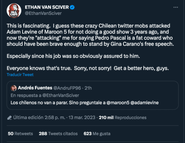 “Esto es fascinante. Supongo que estas locas turbas chilenas de Twitter atacaron a Adam Levine de Maroon 5 por no hacer un buen programa hace 3 años, y ahora me ‘atacan’ a mí por decir que Pedro Pascal es un gordo cobarde que debería haber sido lo suficientemente valiente como para apoyar la libertad de expresión de Gina Carano“, espetó nuevamente.