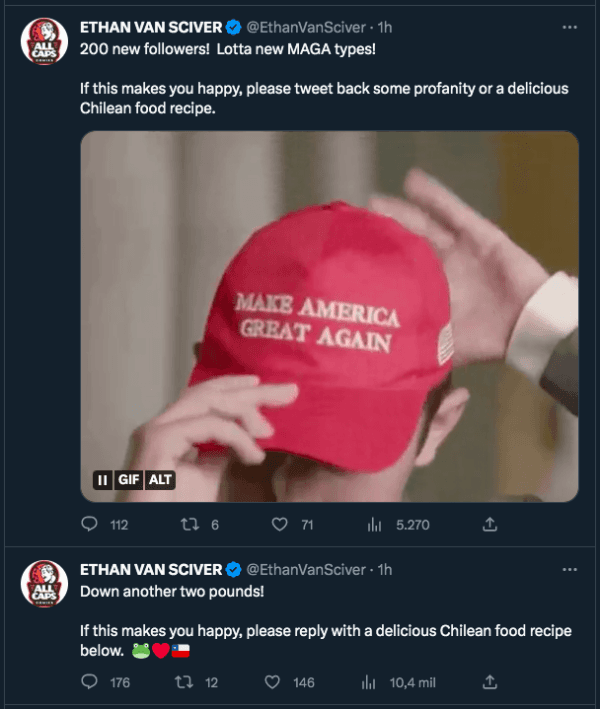 “200 nuevos seguidores! ¡Muchos tipos nuevos de MAGA! Si esto te hace feliz, twittea alguna blasfemia o una deliciosa receta de comida chilena”, escribió este martes.