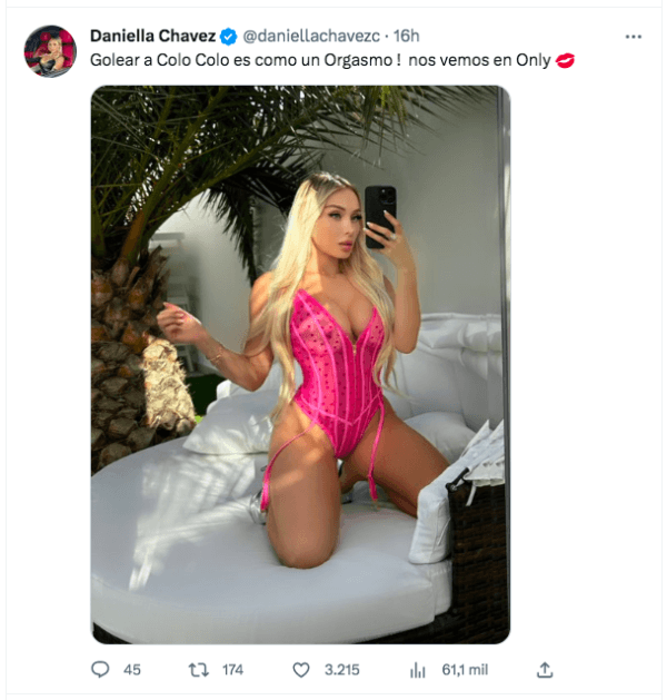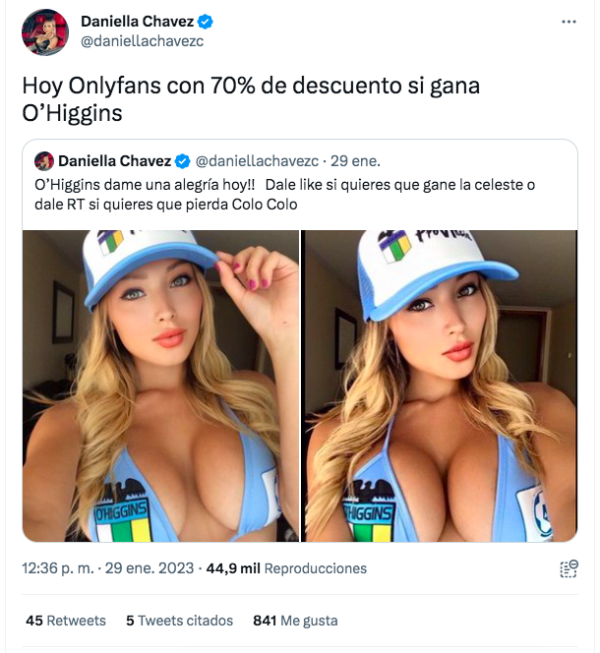 Un poco más tarde -y más osada, también-, Daniella le indicó a sus seguidores que “hoy Onlyfans con 70% de descuento si gana O’Higgins”.