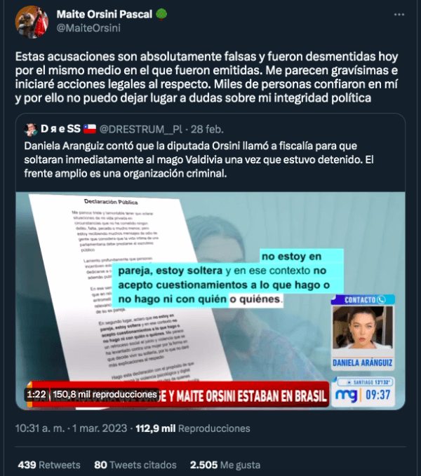 24 horas más tarde, durante la mañana del miércoles, Maite Orsini hizo una publicación que dejó en shock a la opinión pública, sosteniendo que “Estas acusaciones son absolutamente falsas y fueron desmentidas hoy por el mismo medio en el que fueron emitidas”.