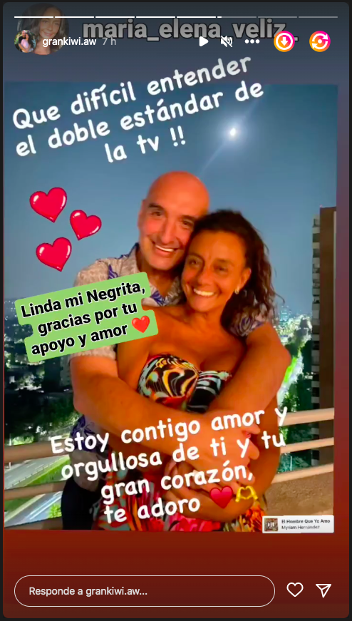 Además, agradeció el apoyo de su pareja, María Elena Veliz, aprovechando de lanzar un nuevo dardo contra la decisión de los ejecutivos del canal: “¡Qué difícil entender el doble estándar de la TV! Estoy contigo, amor y orgullosa de ti y tu gran corazón, te adoro”.