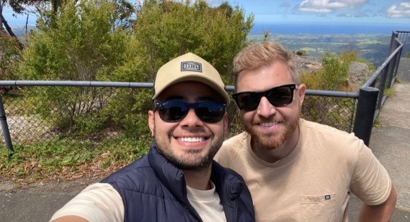En una foto aparece acompañado por un joven rubio, sonriente y ataviado con lentes, en medio de un paisaje que parece un sector rural turístico del país oceánico.