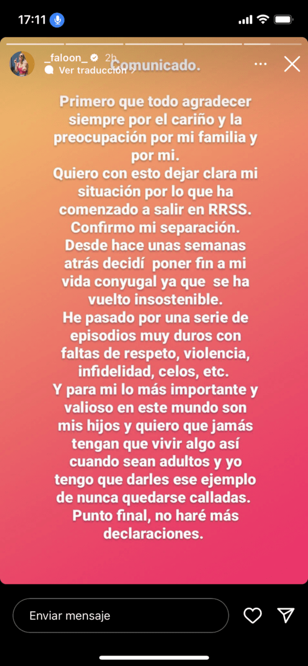Fue por medio de las historias de su Instagram que Faloon hizo una declaración pública donde indicó que el quiebre es real en el matrimonio que cuenta tres años de existencia.