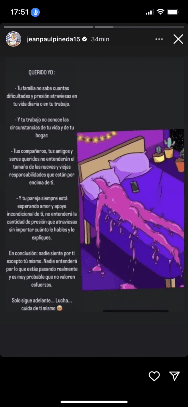 En conclusión, “nadie siente por ti excepto tú mismo. Nadie entenderá por lo que estás pasando realmente y es muy probable que no valoren esfuerzos”, remata el final las publicaciones de Pineda.