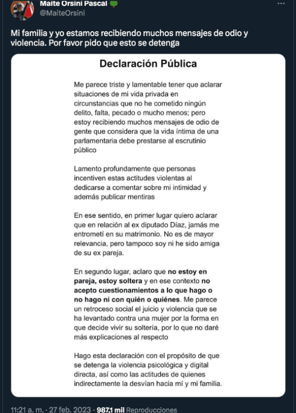 Dadas las declaraciones de Aránguiz, la diputada Maite Orsini decidió salir al paso de la polémica este lunes, con una “declaración con el propósito que se detenga la violencia psicológica y digital directa”.