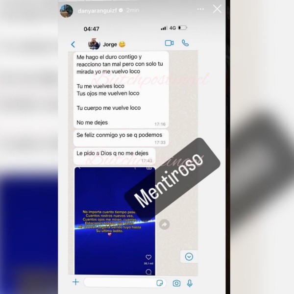 En tanto, la polémica estaría lejos de terminar, porque Daniela volvió a alimentar la situación, al compartir en una historia de Instagram el pantallazo de nuevos mensajes que le había enviado Jorge Valdivia, rogándole perdón.