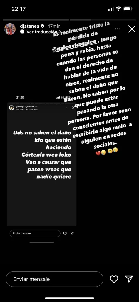 “Es realmente triste la pérdida de Galee Galee. Tengo pena y rabia. ¿Hasta cuándo las personas se dan el derecho de hablar de la vida de otros?“, cuestionó.