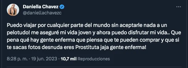 “Cuando creen que con dinero pueden tener todo y no sabe que me va muy bien en la vida y no necesito acostarme con idiotas”, puntualizó Chávez incrementando su furia.