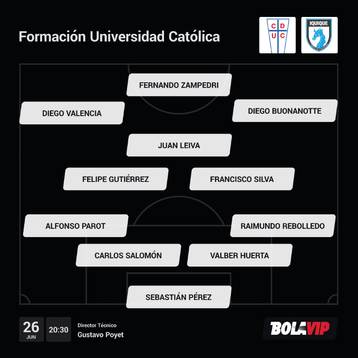De esta manera, el equipo inicial de Universidad Católica sería con Sebastián Pérez en el arco; Raimundo Rebolledo, Valber Huerta, Carlos Salomón y Alfonso Parot en defensa; Francisco Silva, Felipe Gutiérrez y Juan Leiva en el centro del terreno de juego; Diego Buonanotte, Fernando Zampedri y Diego Valencia en el ataque.