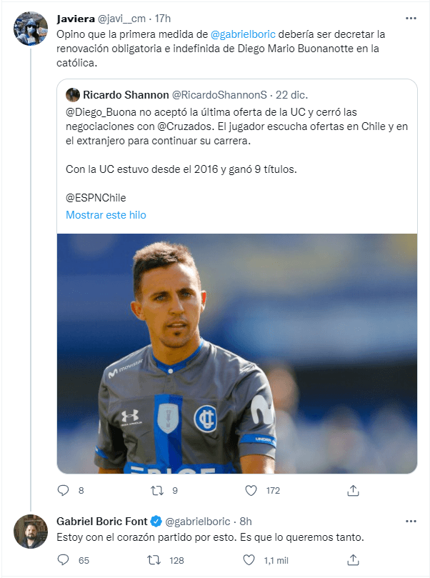 Y es que los hinchas cruzados rapidamente se tomaron las redes sociales producto de que la renovación de Buonanotte debería ser de forma obligatoria como su primera medida al mando del país en La Moneda.
