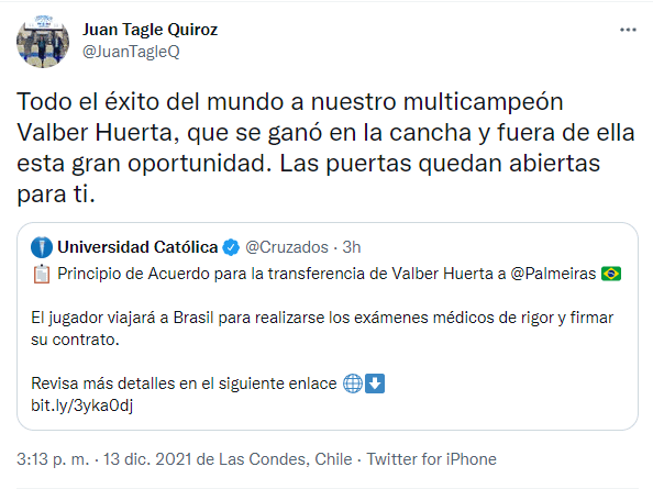 “Todo el éxito del mundo a nuestro multicampeón Valber Huerta, que se ganó en la cancha y fuera de ella esta gran oportunidad. Las puertas quedan abiertas para ti”, escribió el mandatorio cruzado mediante su cuenta de Twitter.