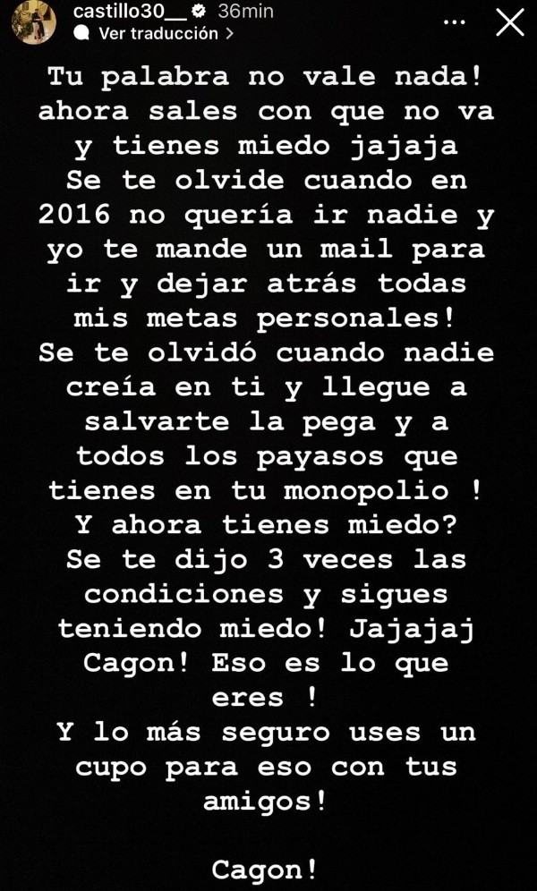 “Tu palabra no vale nada! Ahora sales con que no va y tienes miedo jajajá. Se te olvide cuando en 2016 no quería ir nadie y yo te mande un mail para ir y dejar atrás todas mis metas personales! Se te olvidó cuando nadie creía en ti y llegue a salvarte la pega a todos los payasos que tienes en tu monopolio”, disparó Castillo.