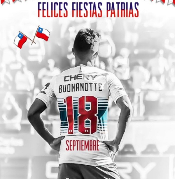Luego, Buonanotte aprovechó de mandar un guiño a todos los hinchas de la Católica y con una imagen llena de banderas de Chile escribió: “Felices Fiestas Patrias”. En dicha imagen aparece el Enano con la camiseta “18” que utilizó en su estadía en los Cruzados y él aporvechó de escribirle septiembre para recordar con afecto a todos los chilenos.