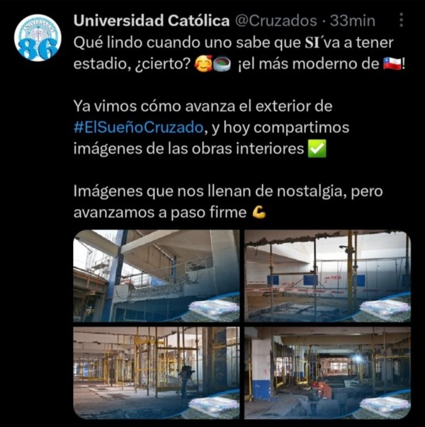 “Qué lindo cuando uno sabe que SÍva a tener estadio, ¿cierto? ¡el más moderno de Chile! Ya vimos cómo avanza el exterior de #ElSueñoCruzado, y hoy compartimos imágenes de las obras interiores. Imágenes que nos llenan de nostalgia, pero avanzamos a paso firme”, decía la publicación en Twitter que le da calor al Clásico Universitario.