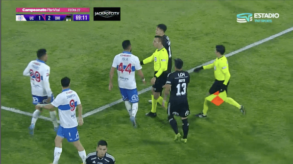 Isla, en el minuto 69, armó la grande en el arco sur del recinto de la UC. Luego de la disputa de balón de José Pedro Fuenzalida, según se aprecia en las imágenes de TNT Sports, el Huaso se le salió la cadena y encima del árbitro Piero Maza el jugador de la Selección Chilena se agarró con todo con el “Experiencia” Carrasco.