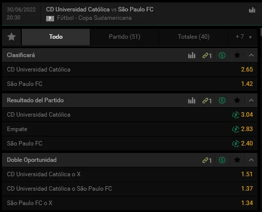 Universidad Católica recibe a Sao Paulo por la ida de los octavos de final de la Copa Sudamericana 2022 en San Carlos de Apoquindo, buscando un buen resultado de cara a la revancha en Brasil. Por eso, juégatela por tu favorito para ganar este compromiso.