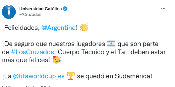 “¡Felicidades, Argentina! ¡De seguro que nuestros jugadores que son parte deLos Cruzados, Cuerpo Técnico y el Tati deben estar más que felices!”, escribieron en la red del pajarito.