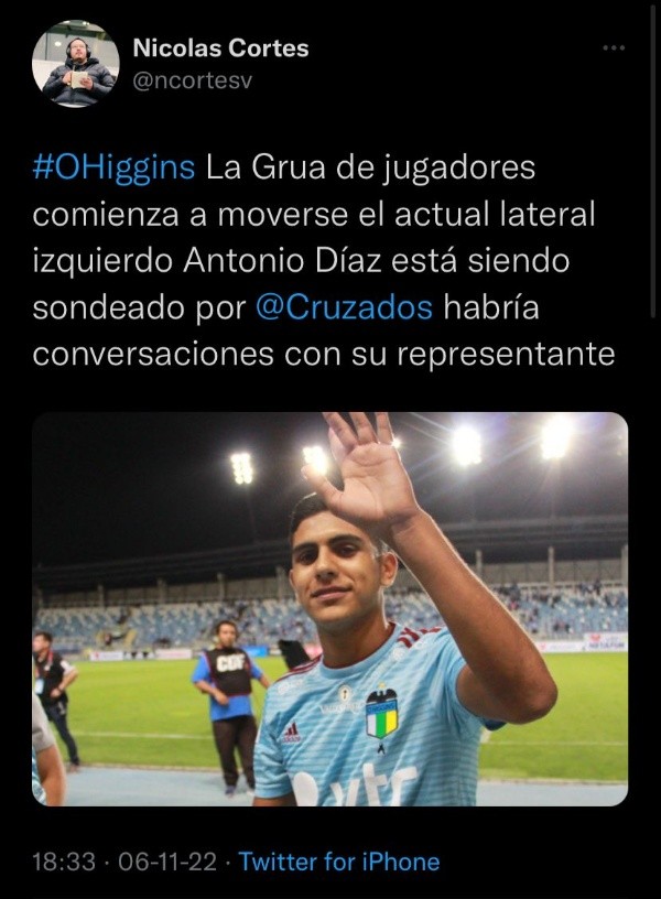 “La Grúa de jugadores comienza a moverse el actual lateral izquierdo Antonio Díaz está siendo sondeado por Universidad Católica, habría conversaciones con su representante”, detalló en su cuenta de Twitter.