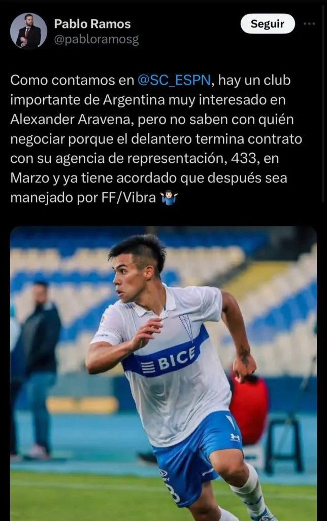 “Como contamos en Sportcenter, hay un club importante de Argentina muy interesado en Alexander Aravena”, fue lo que indicó el comunicador.