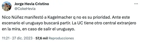 “Nico Núñez manifestó a Kagelmacher que no es su prioridad. Ante este escenario el uruguayo buscará partir. La UC tiene otro central extranjero en la mira, en caso de salir el uruguayo”, detalló Jorge ‘Coke’ Hevia a través de Twitter.
