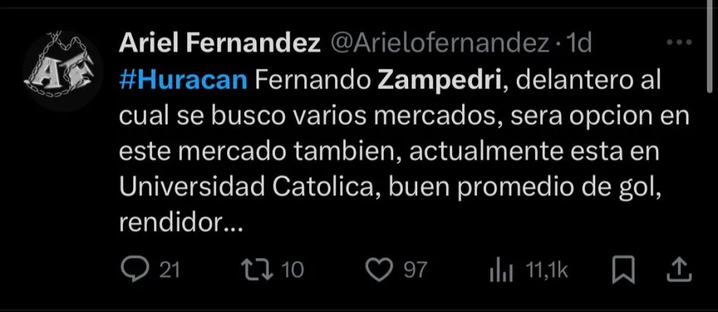 “Fernando Zampedri, delantero el cuál buscó varios mercados, será opción en este mercado también, actualmente está en Universidad Católica, buen promedio de gol, rendidor”, indicó.