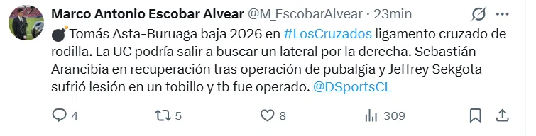 La información fue dada a conocer por el periodista Marco Escobar Alvear, quien señaló que el zaguero Cruzado sufrió una rotura de ligamento cruzado, una de las lesiones más complejas para los futbolistas.
