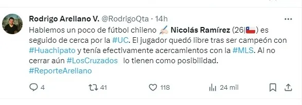 Según informó el periodista nacional Rodrigo Arellano, desde la UC estarían siguiendo de cerca la situación del defensor Nicolás Ramírez, quien fue gran figura del Huachipato campeón en el 2023.